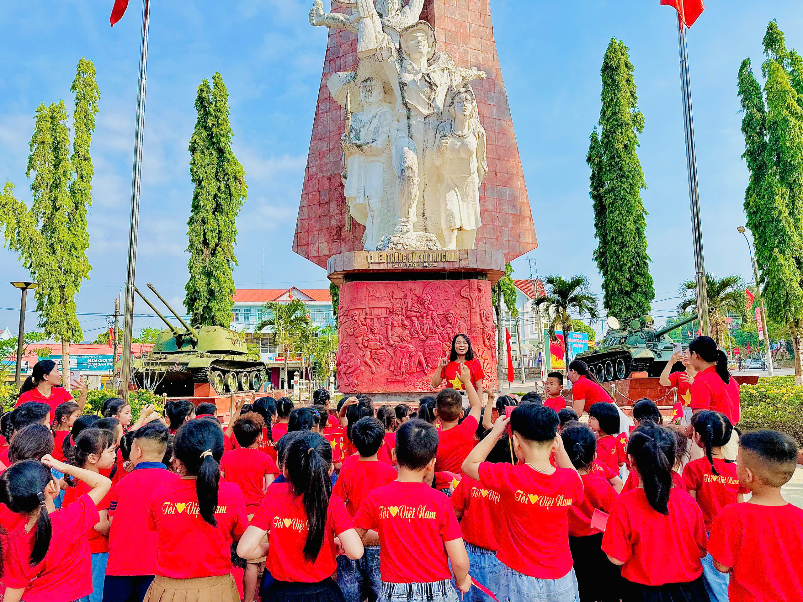 Học sinh khối MG 4-5 tuổi và khối MG 5-6 tuổi trải nghiệm, tham quan Tượng đài chiến thắng Đăk Tô- Tân Cảnh , xe tăng 377, 472, nhà rông văn hoá và quảng trường 24/4