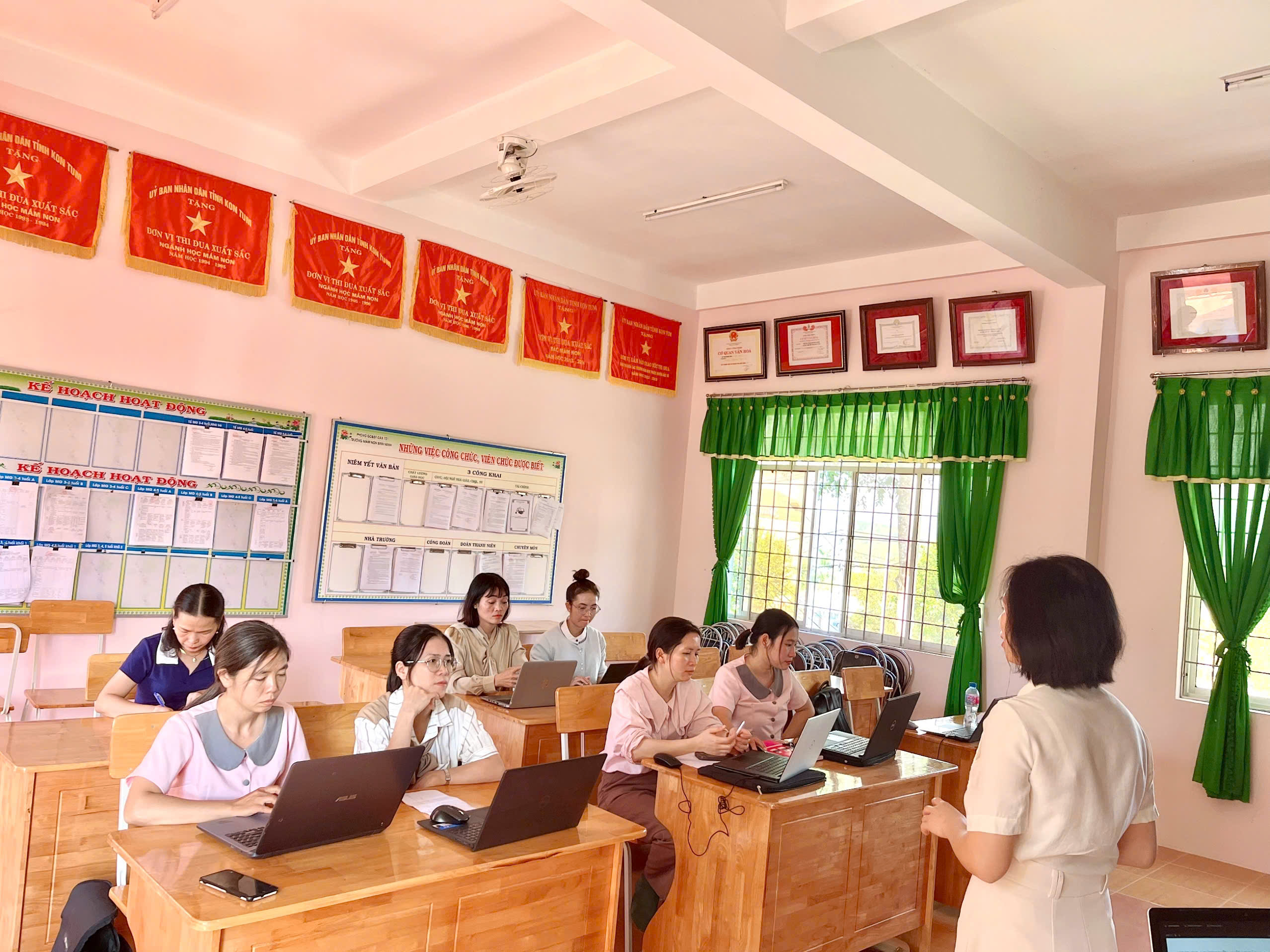 Tháng 2, ba tổ chuyên môn của trường đã tổ chức sinh hoạt với chủ đề “Ứng dụng kỹ năng số”, tập trung hướng dẫn giáo viên khai thác hiệu quả các phần mềm phục vụ công tác soạn giảng và tổ chức hoạt động cho trẻ.