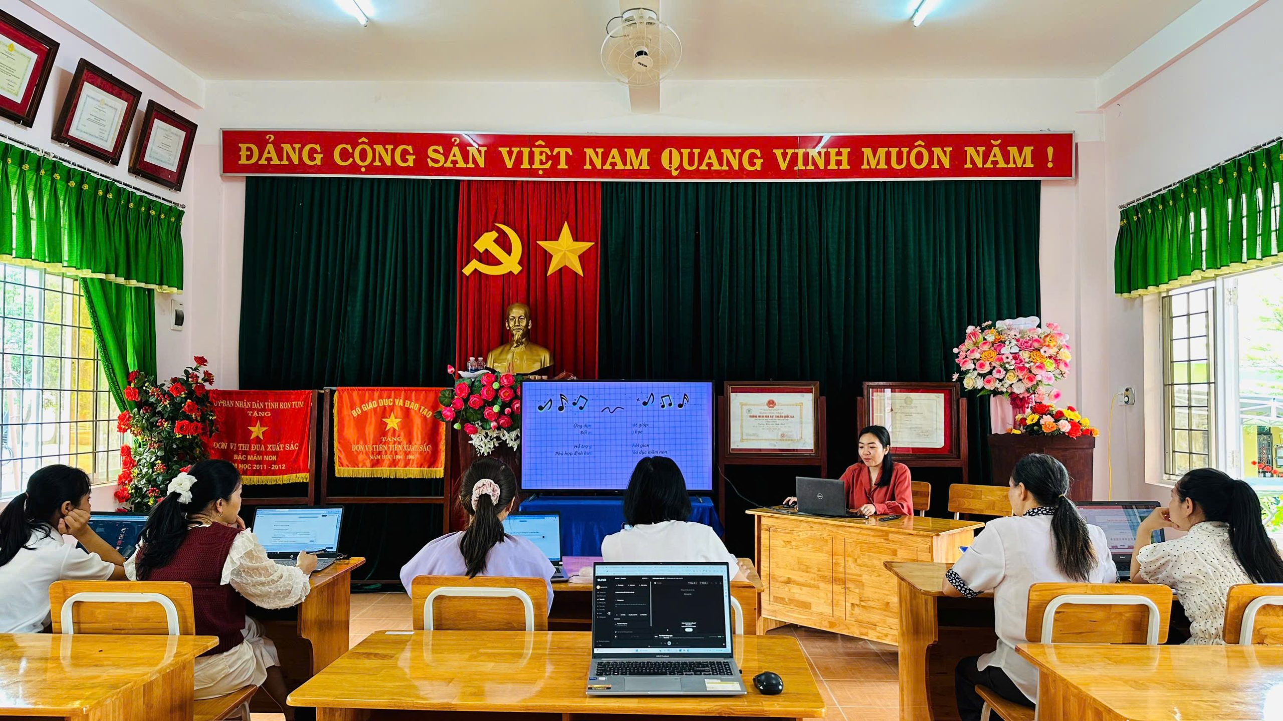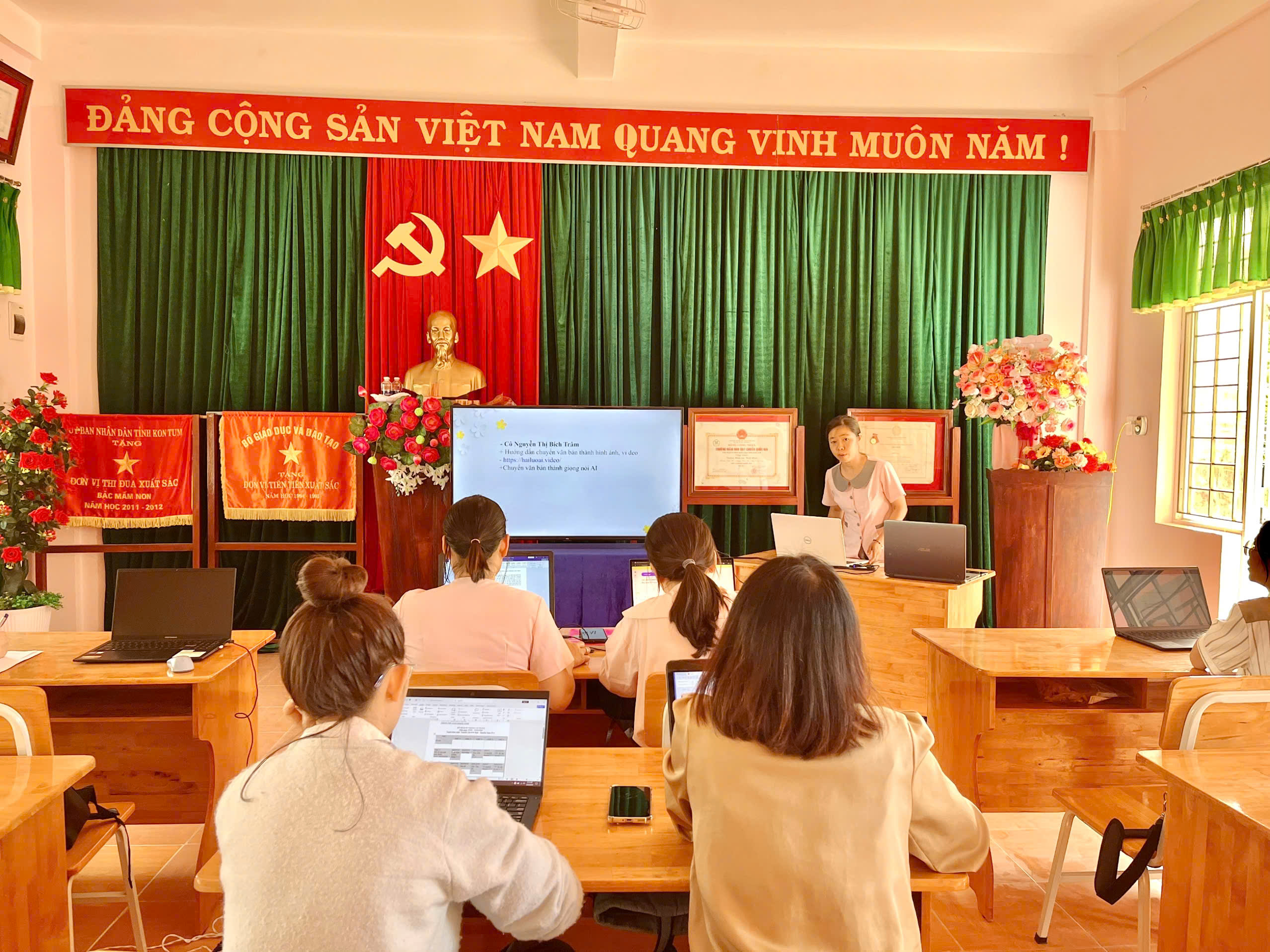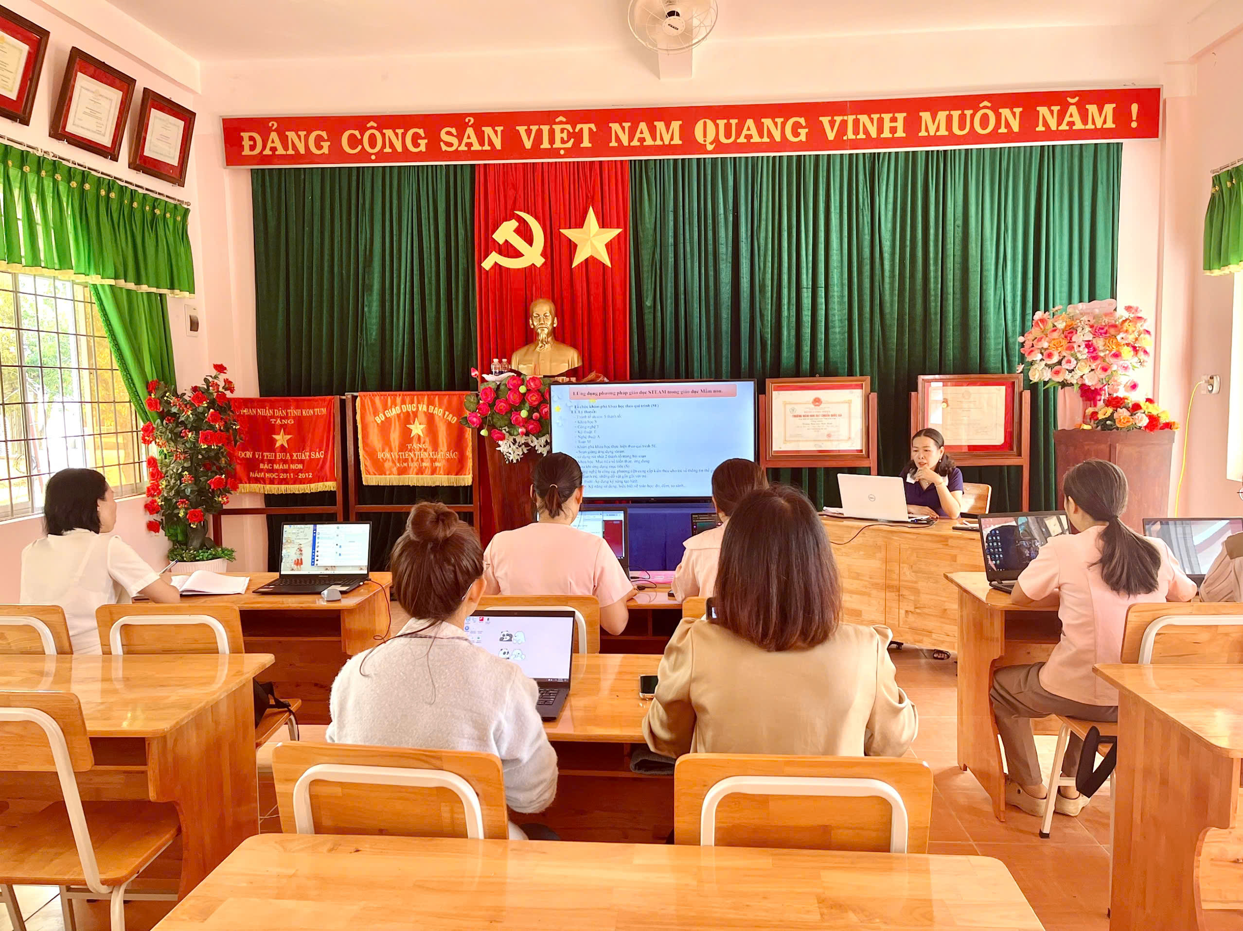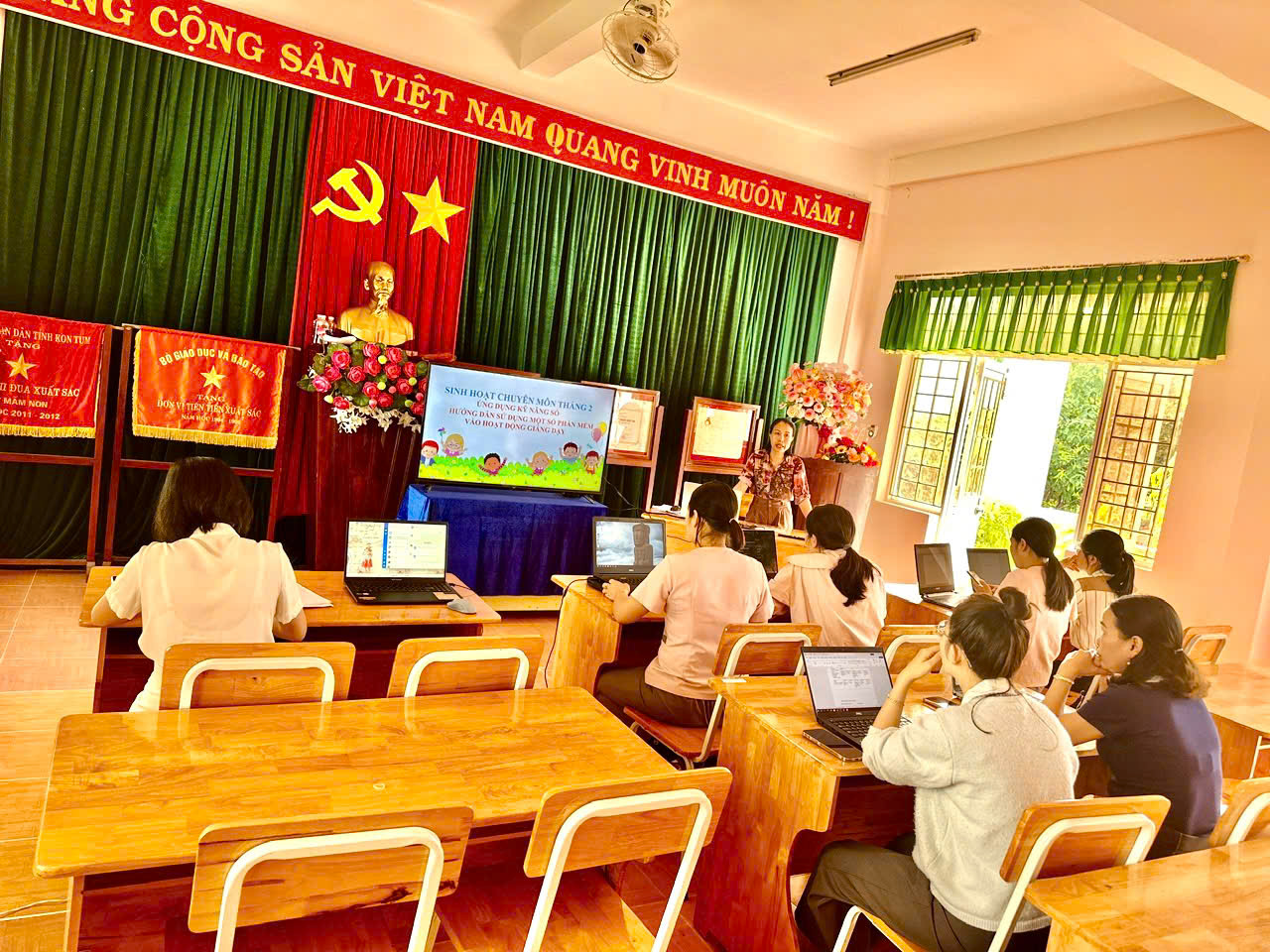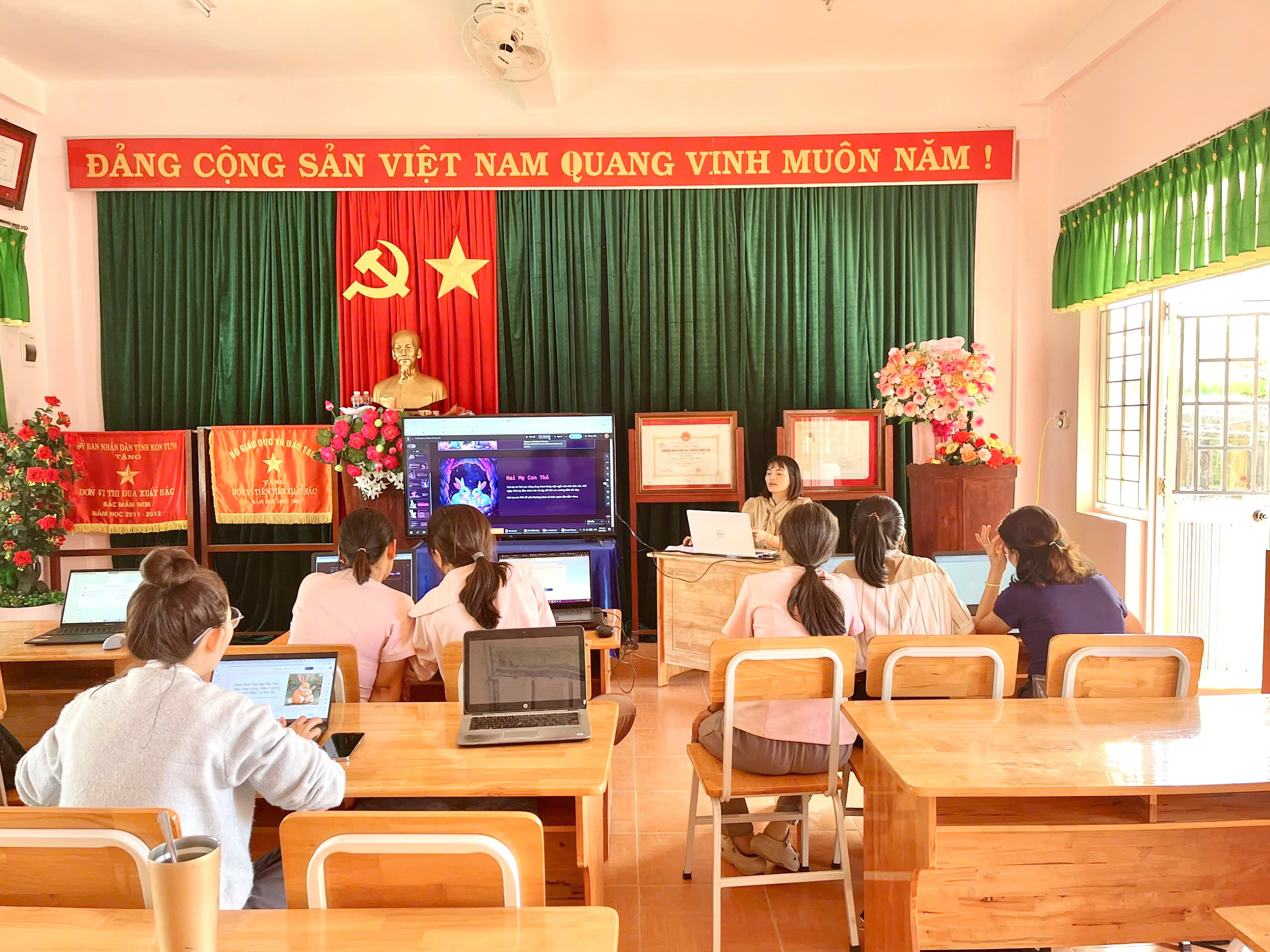 Tháng 2, ba tổ chuyên môn của trường đã tổ chức sinh hoạt với chủ đề “Ứng dụng kỹ năng số”, tập trung hướng dẫn giáo viên khai thác hiệu quả các phần mềm phục vụ công tác soạn giảng và tổ chức hoạt động cho trẻ.