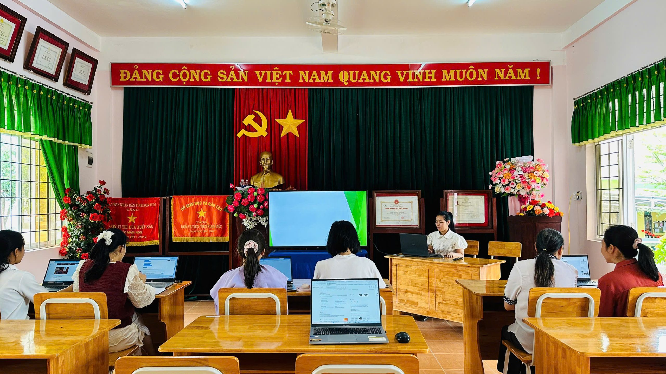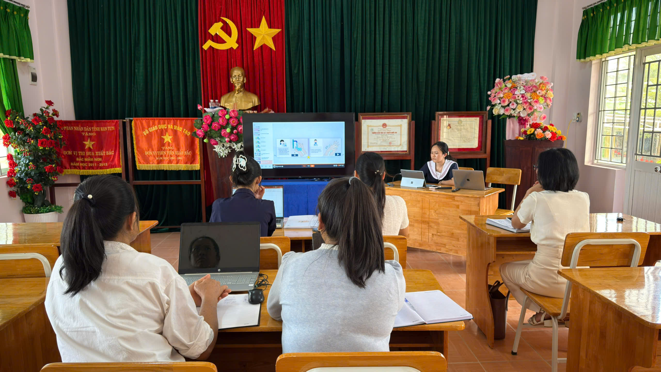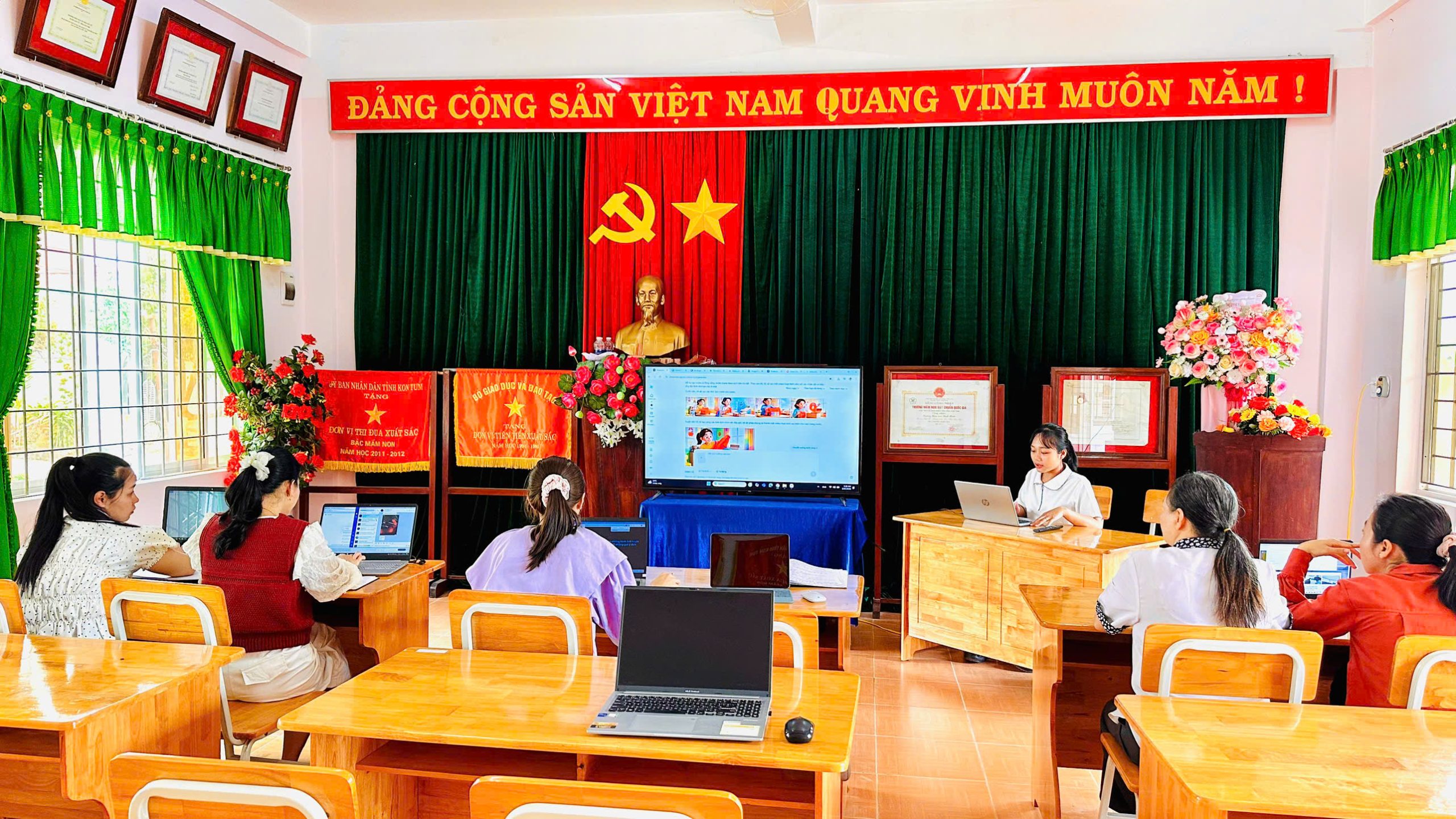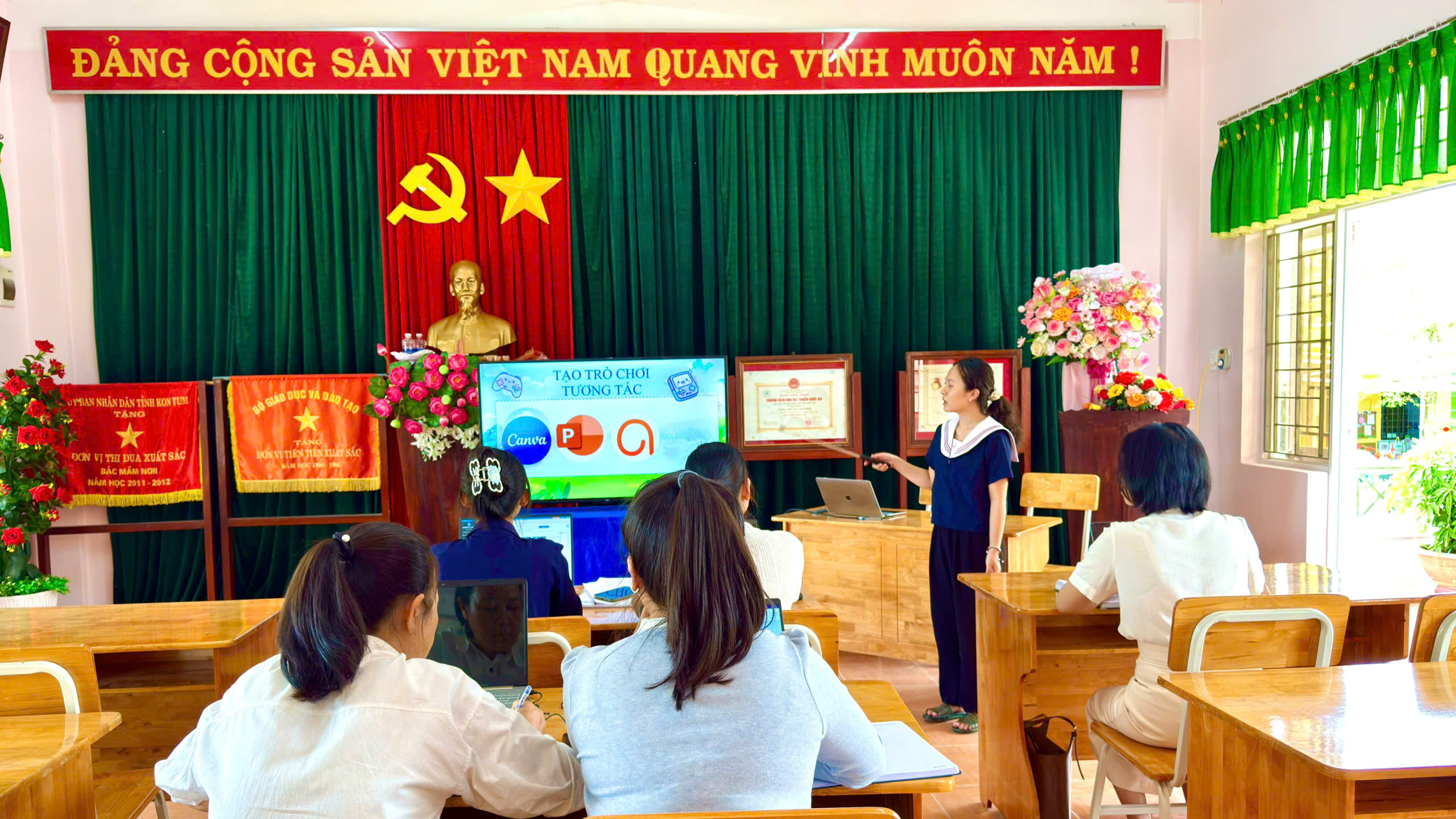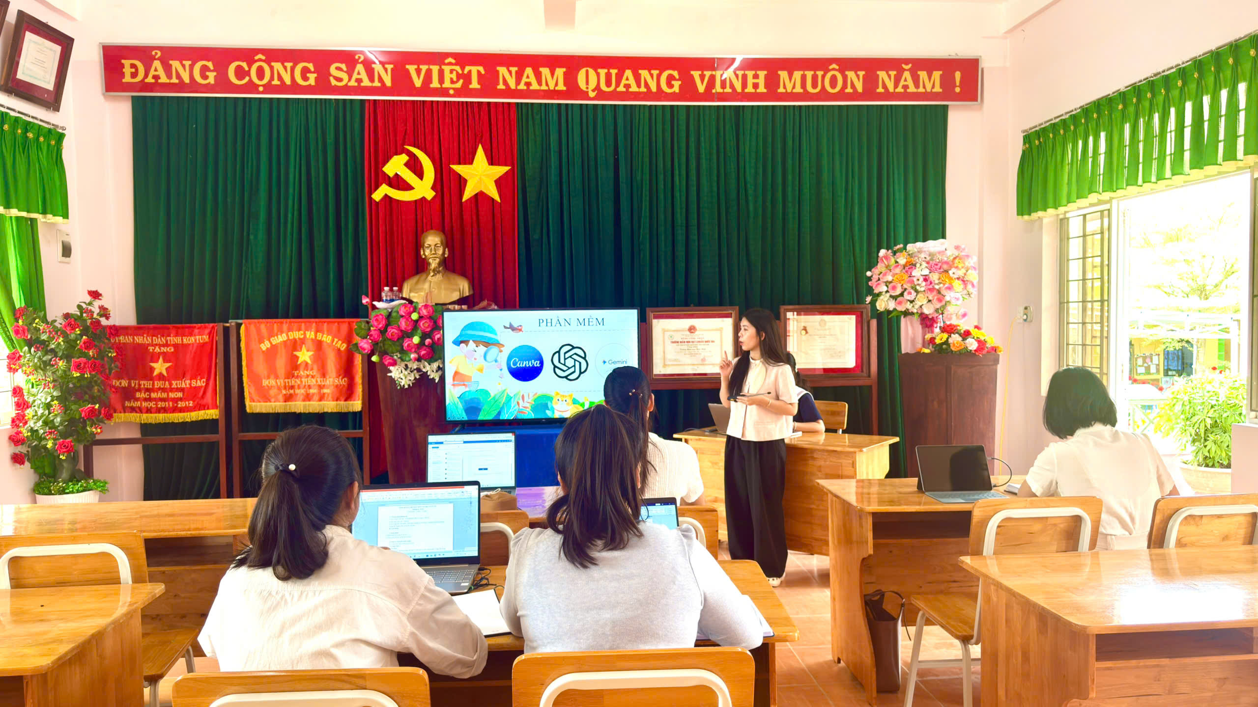 Tháng 2, ba tổ chuyên môn của trường đã tổ chức sinh hoạt với chủ đề “Ứng dụng kỹ năng số”, tập trung hướng dẫn giáo viên khai thác hiệu quả các phần mềm phục vụ công tác soạn giảng và tổ chức hoạt động cho trẻ.