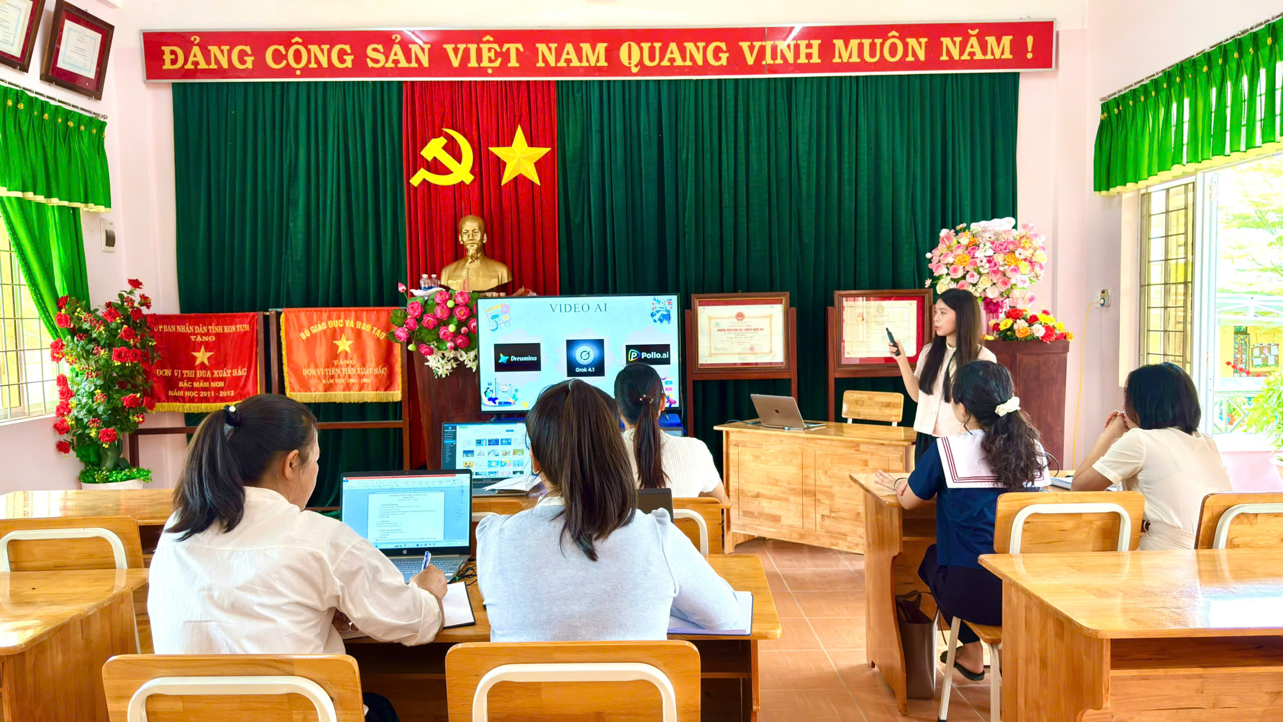 💻 Giáo viên được hướng dẫn sử dụng các công cụ như ChatGPT, Canva, Vbee.ai, Gemini, Speechify, Dreamina, Pollo.ai, Suno, Hailuo AI, Gamma để xây dựng nội dung bài giảng, thiết kế slide, tạo hình ảnh – video AI, giọng đọc, âm nhạc minh họa sinh động.