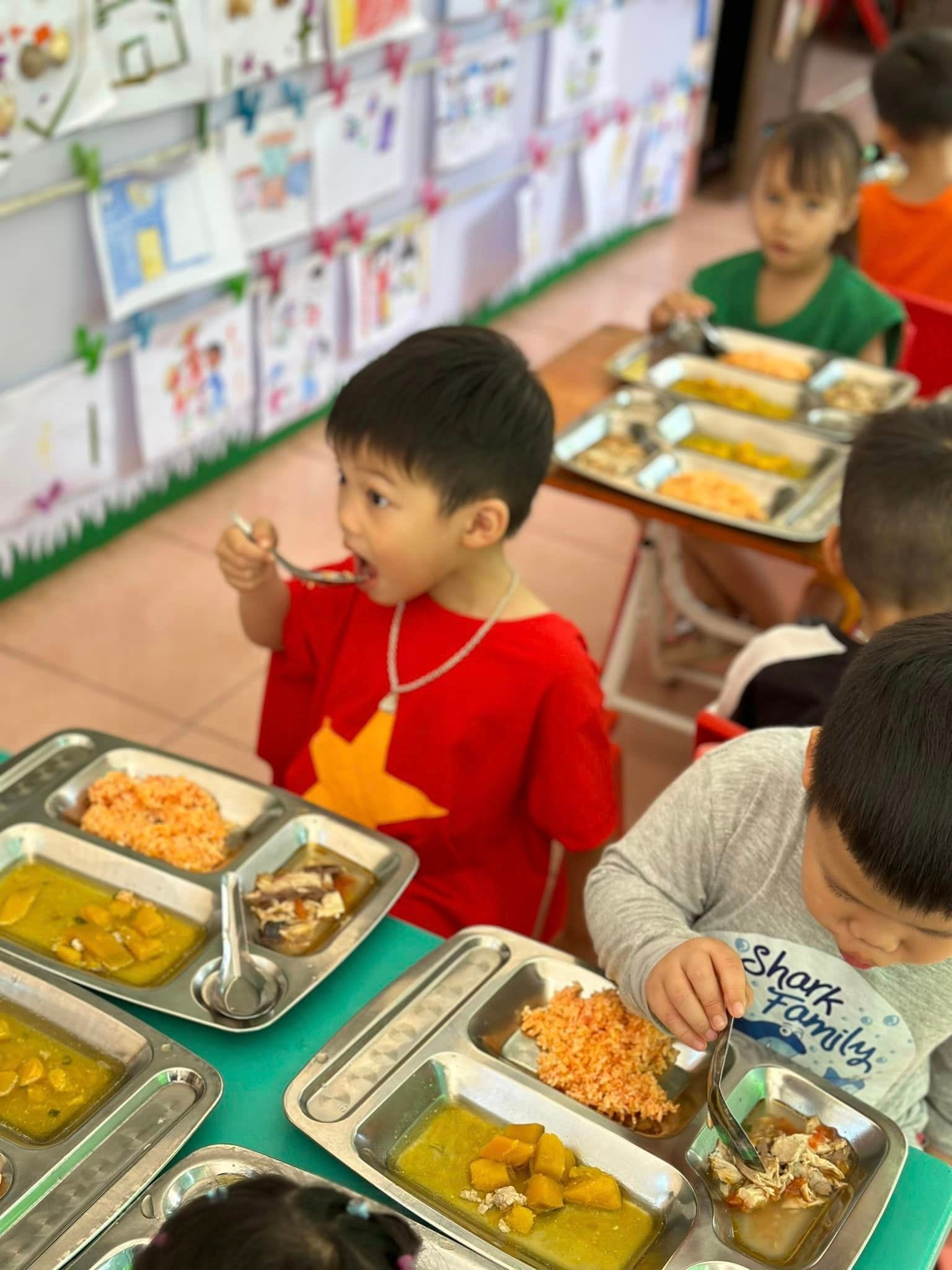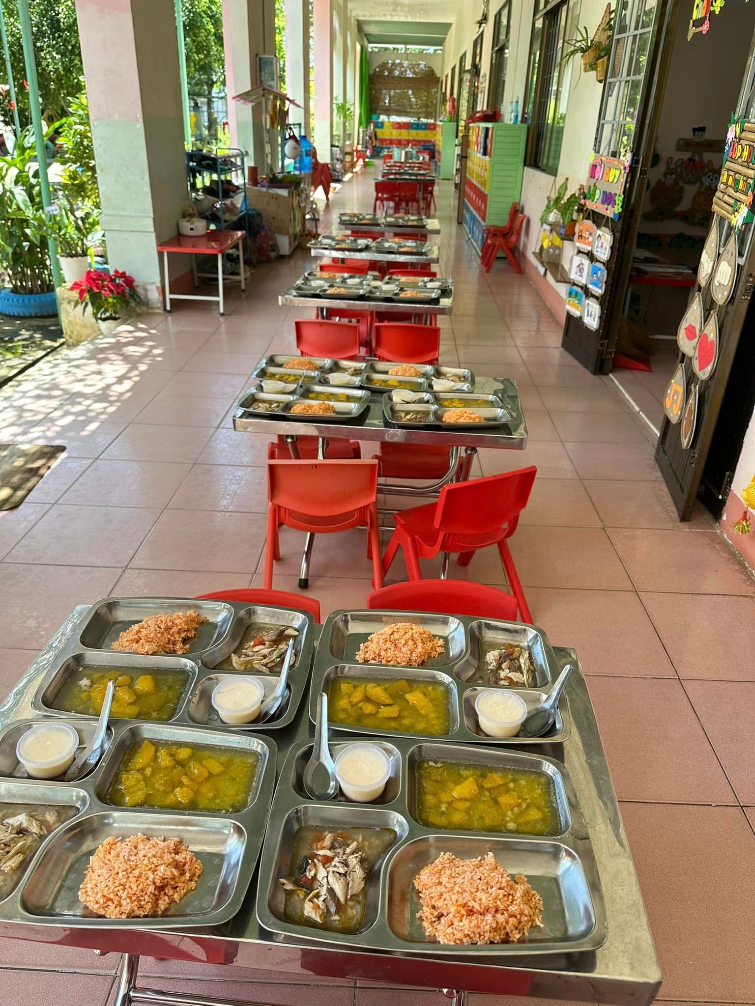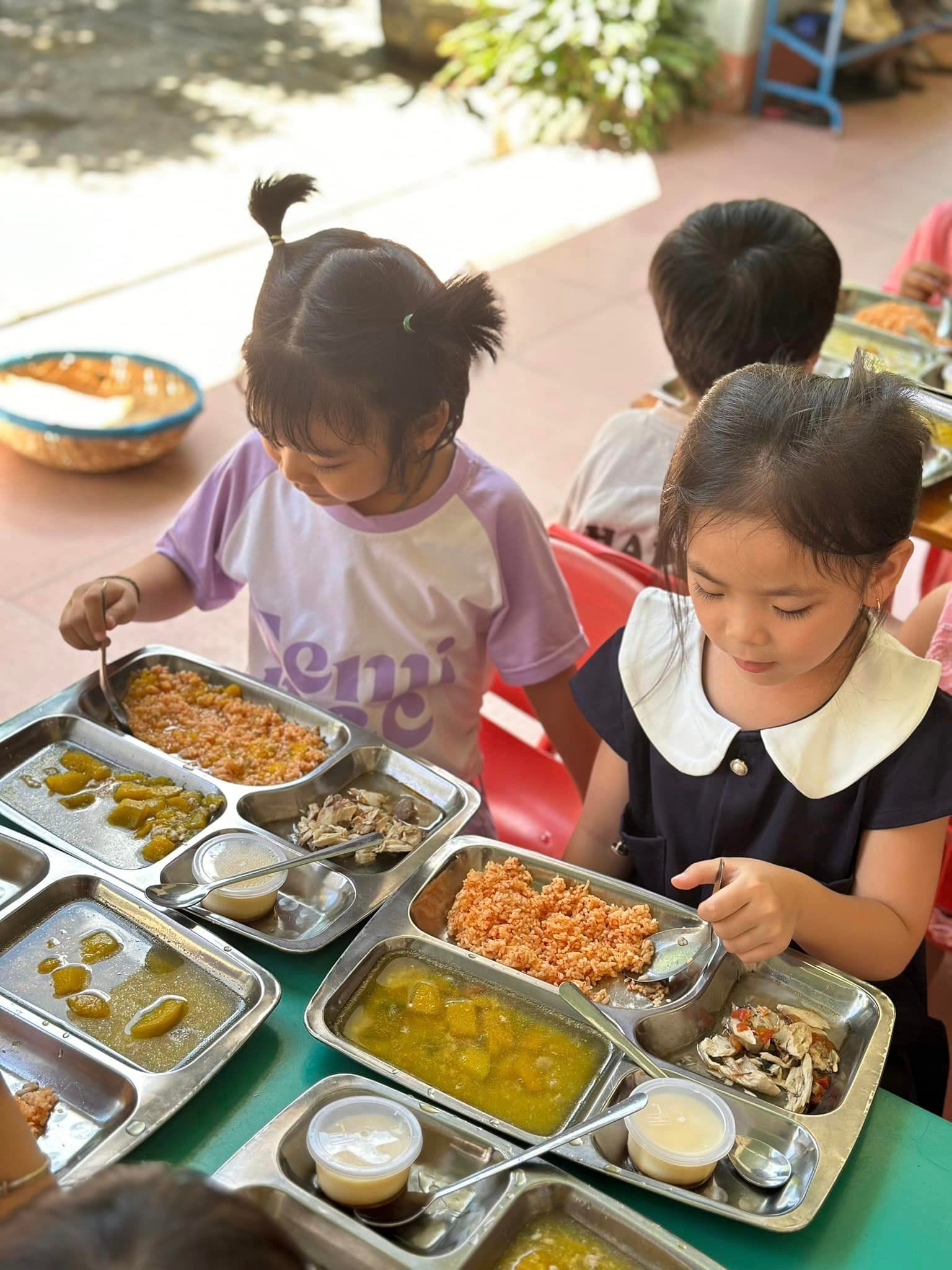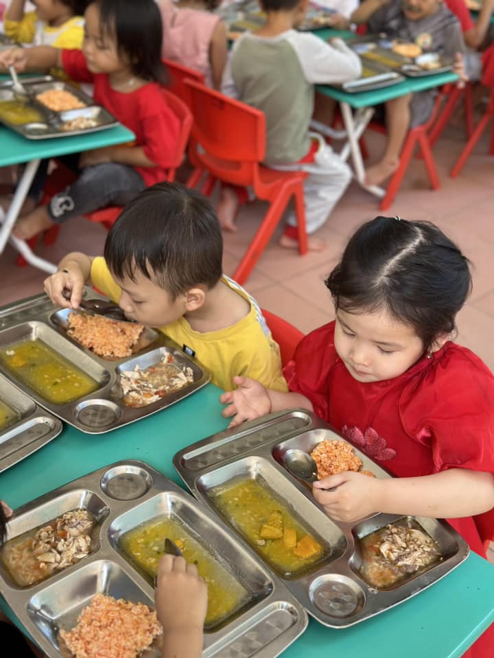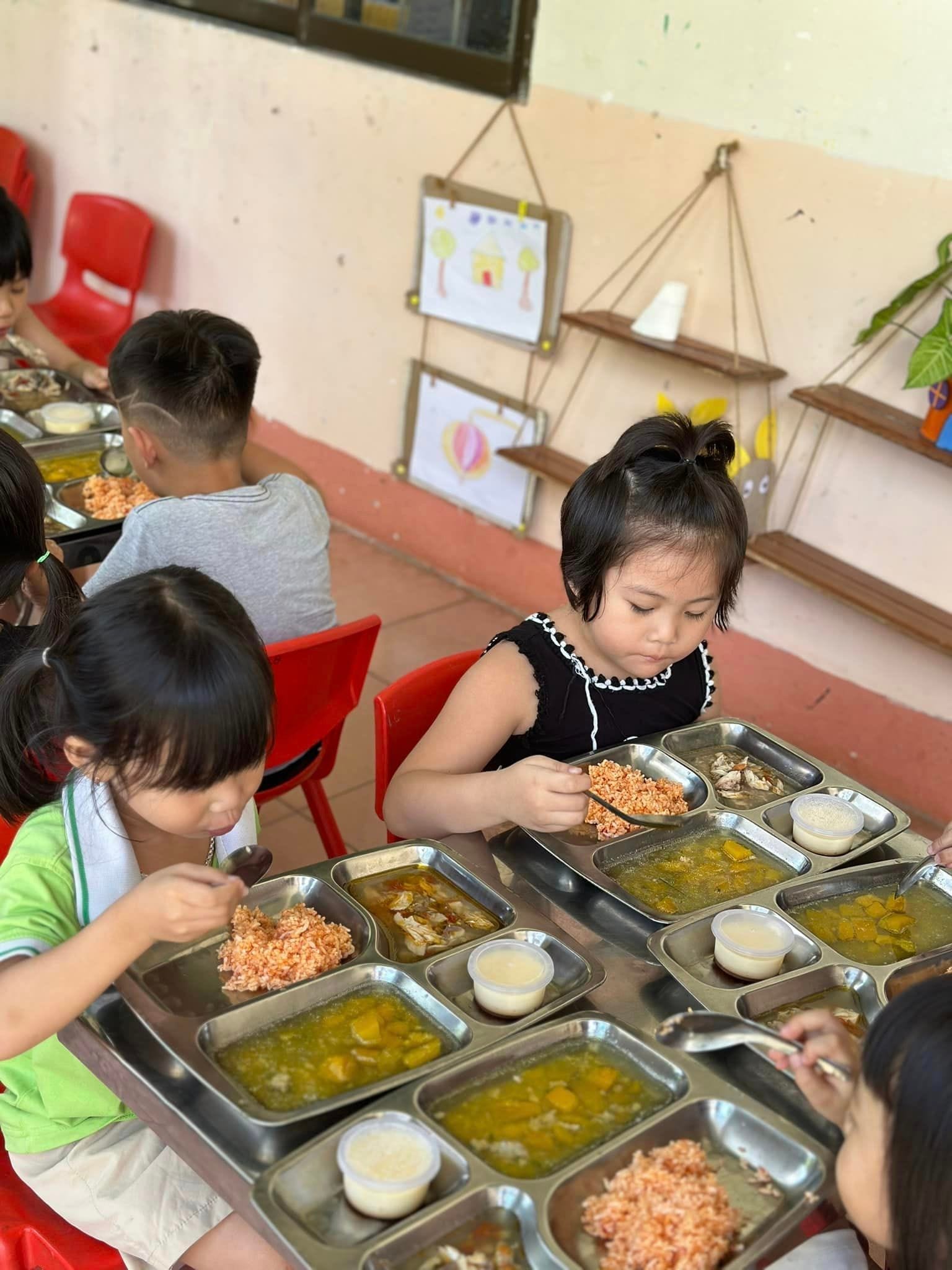 Mỗi ngày đến trường trẻ được ăn 2 bữa tại trường, với thực đơn được thay đổi hàng ngày để bảo đảm sự phong phú hấp dẫn từ các món ăn và đủ chất dinh dưỡng theo yêu cầu.