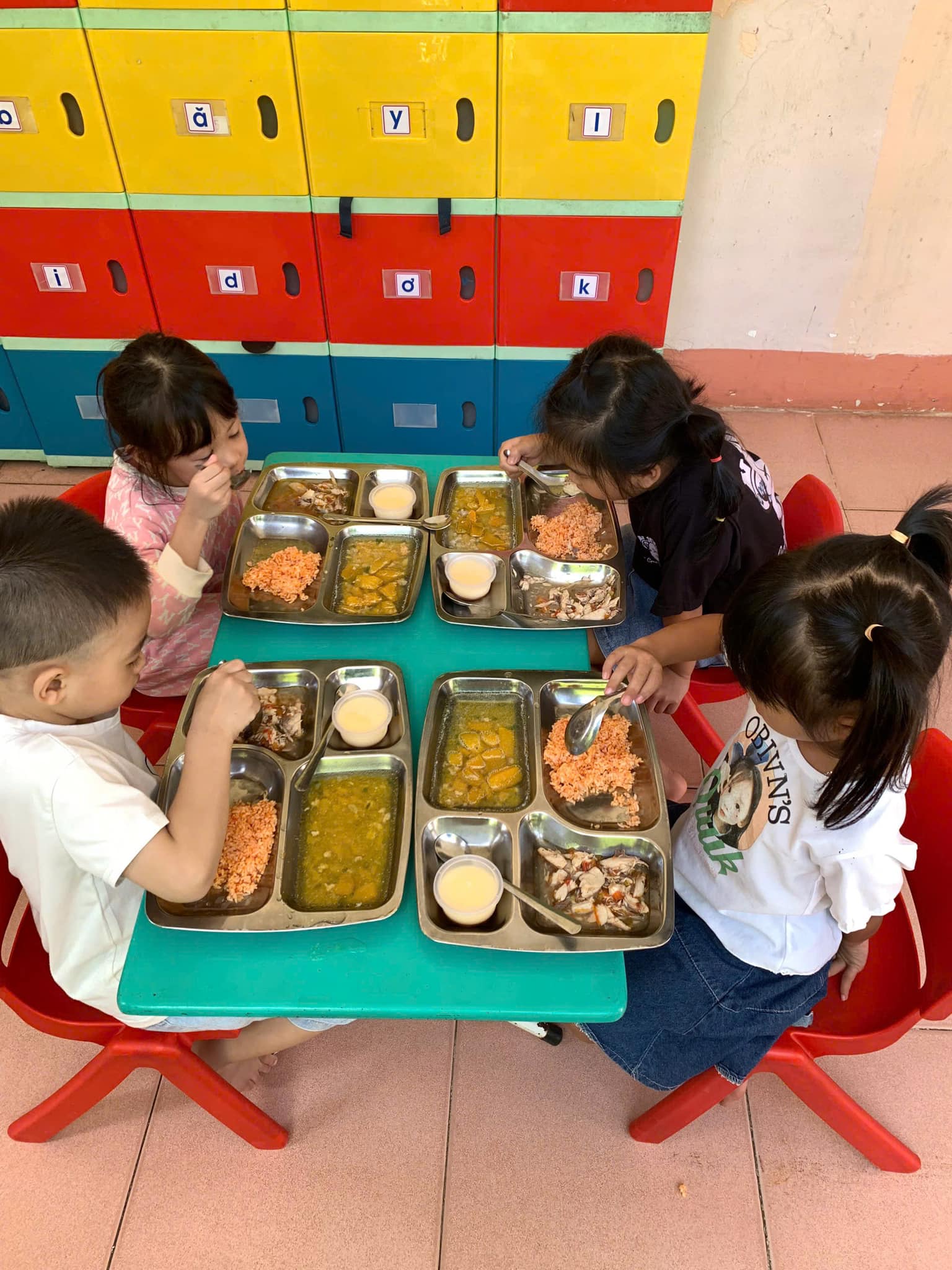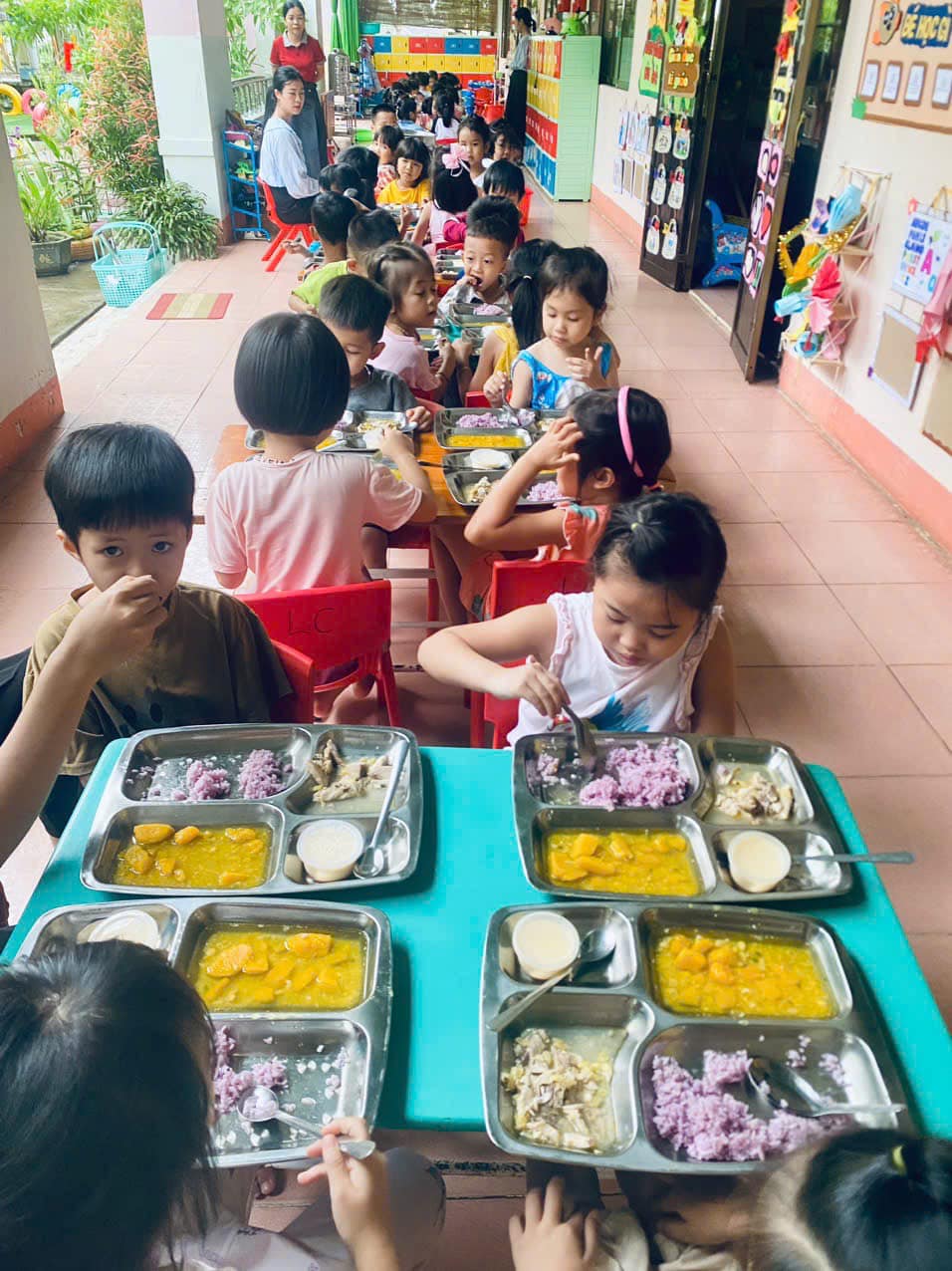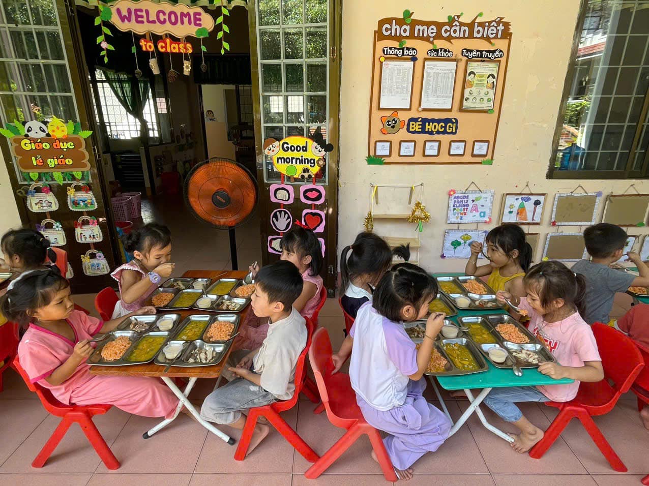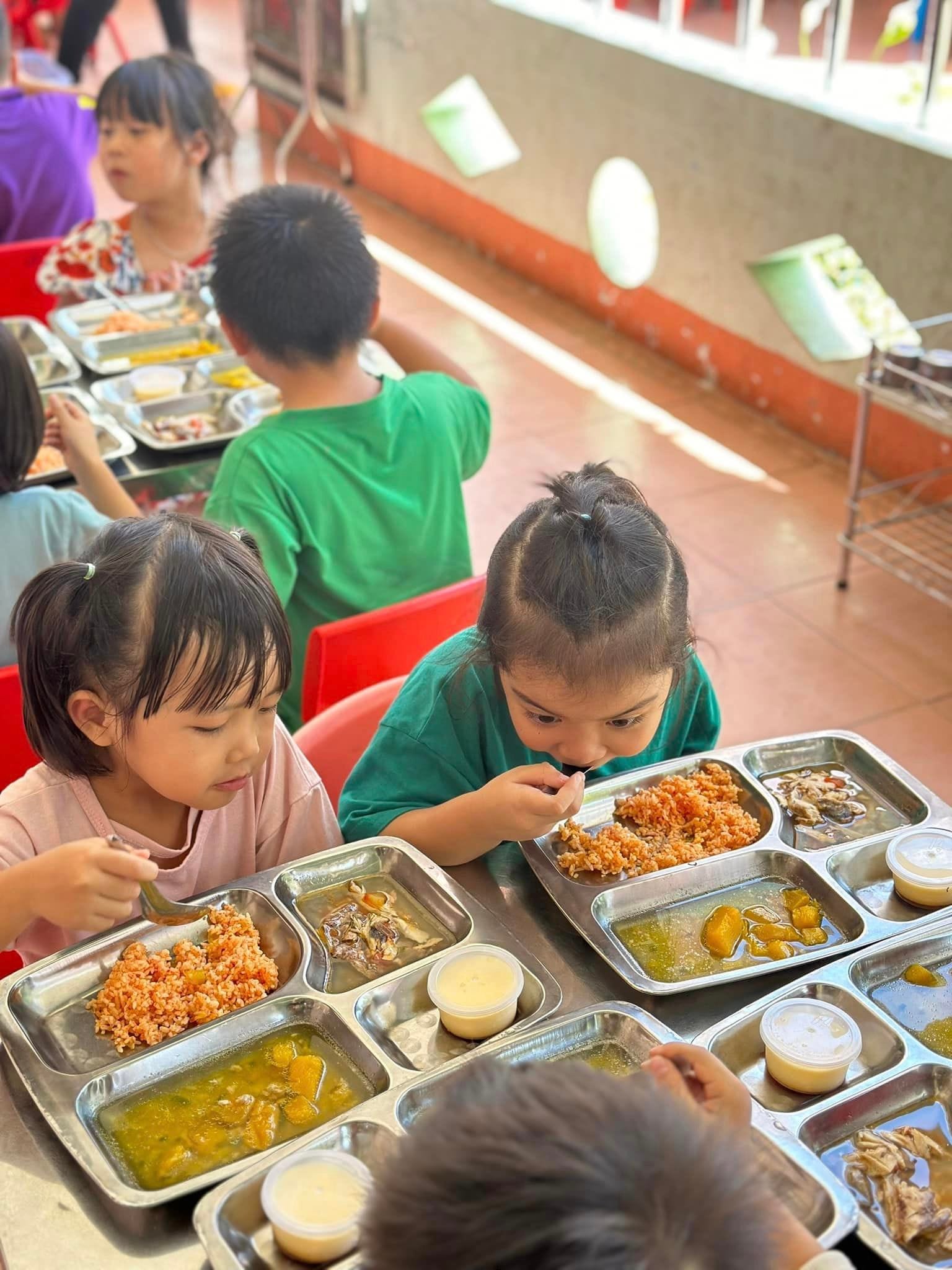Mỗi ngày đến trường trẻ được ăn 2 bữa tại trường, với thực đơn được thay đổi hàng ngày để bảo đảm sự phong phú hấp dẫn từ các món ăn và đủ chất dinh dưỡng theo yêu cầu.