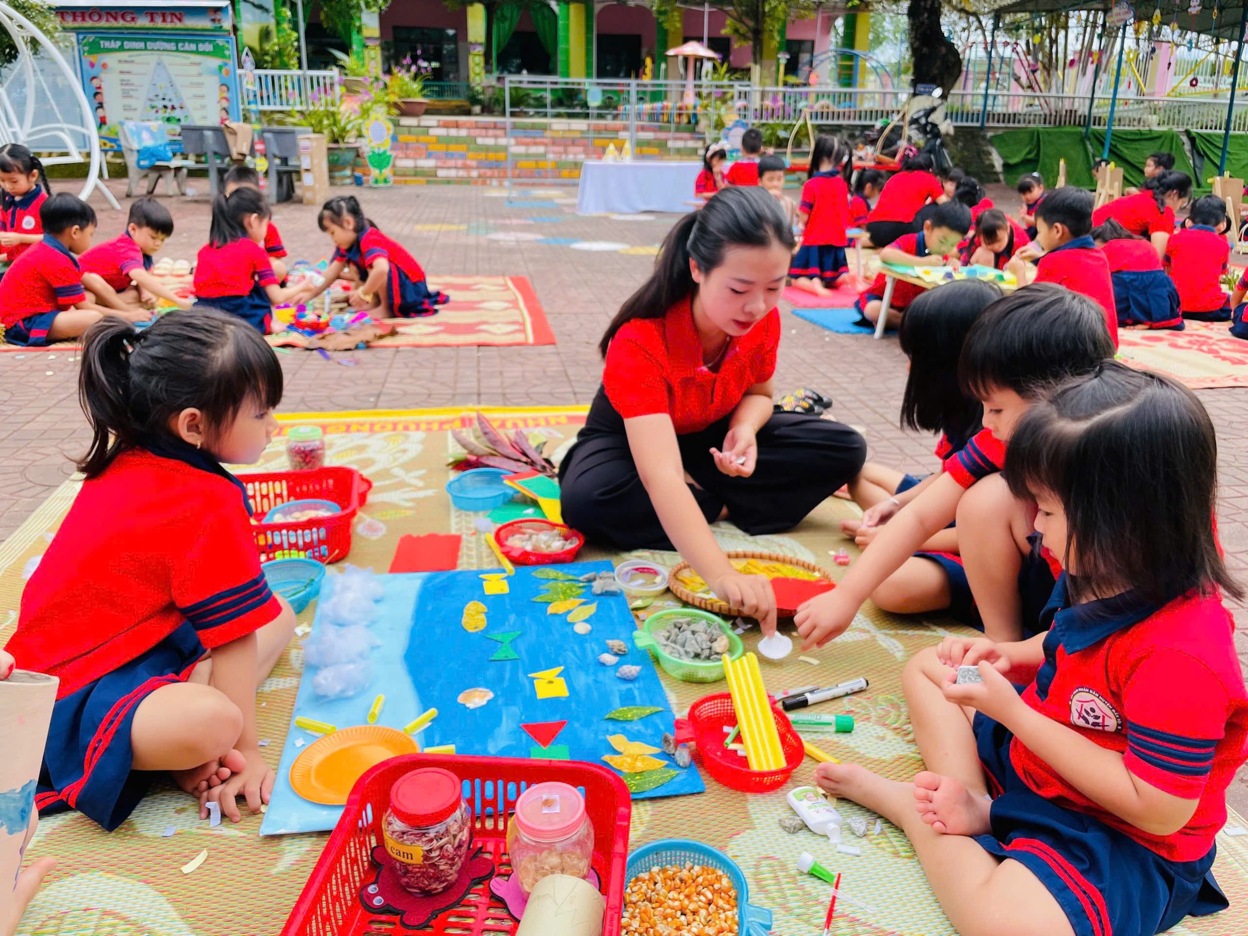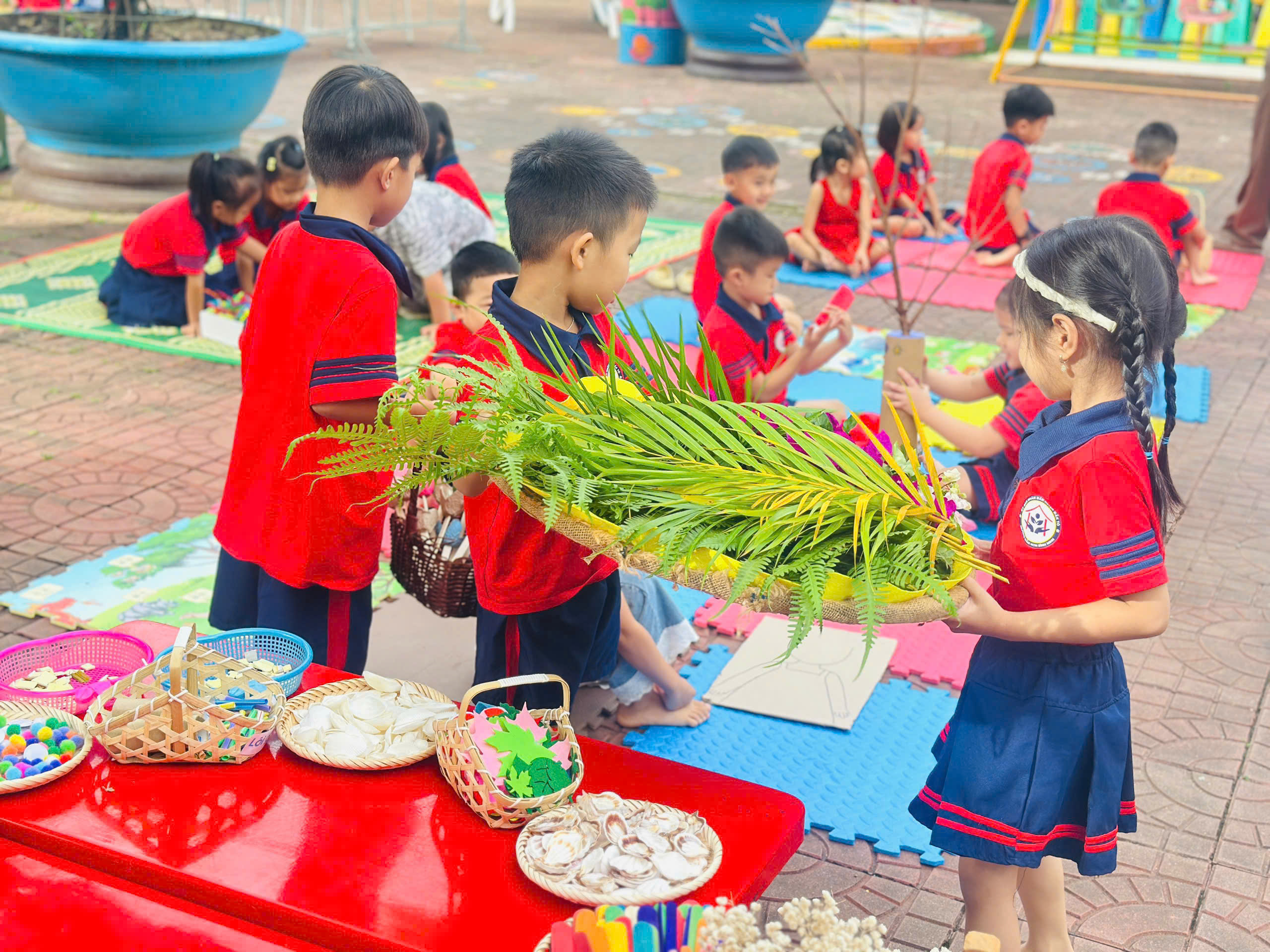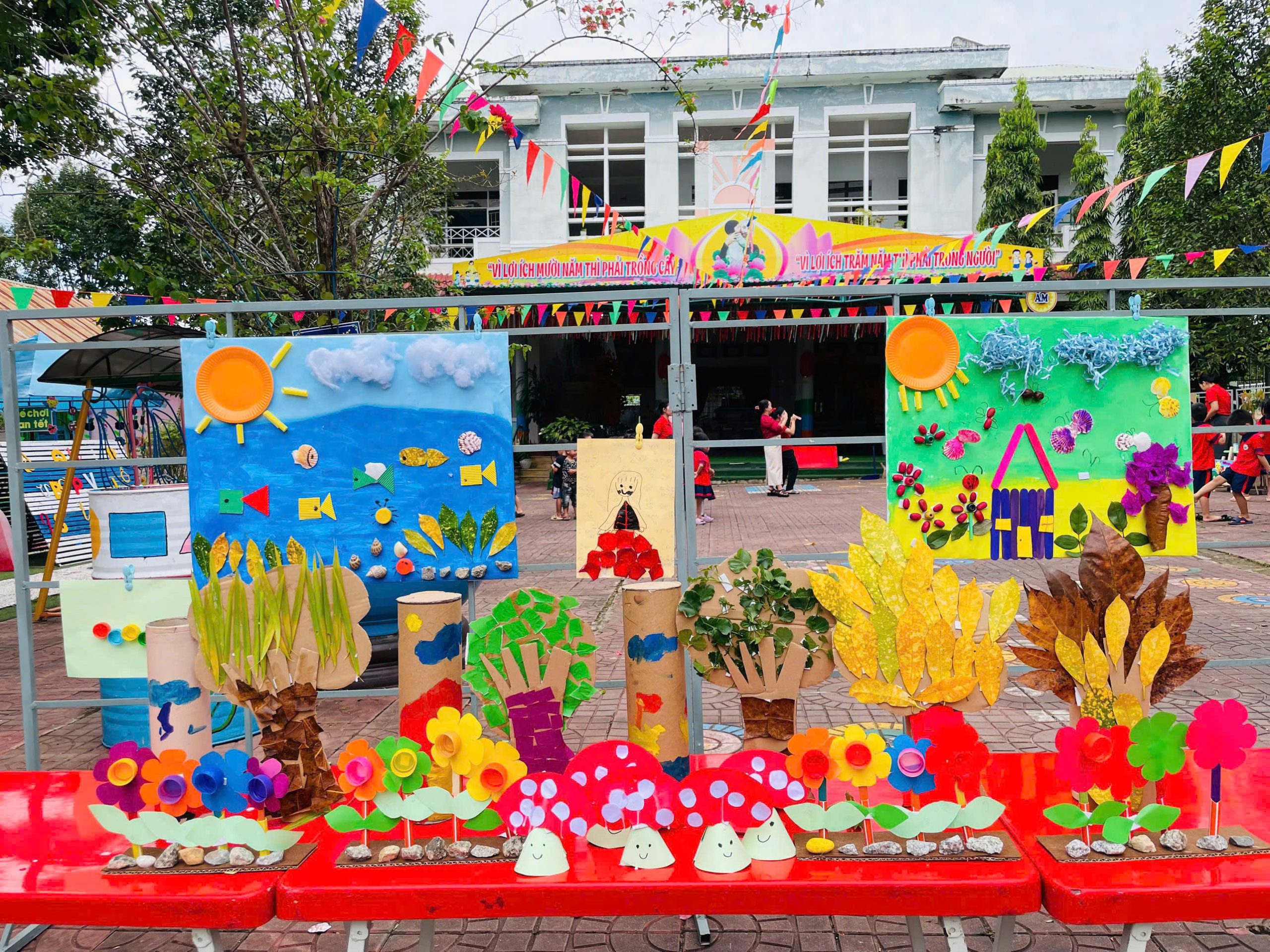 Các bé đã được thỏa sức sáng tạo, khéo léo tạo nên nhiều sản phẩm đáng yêu từ những nguyên vật liệu gần gũi, thân thiện với môi trường như giấy, lá cây, hoa khô, chai nhựa, lõi giấy, hột hạt, bìa cát tông, khay trứng,…