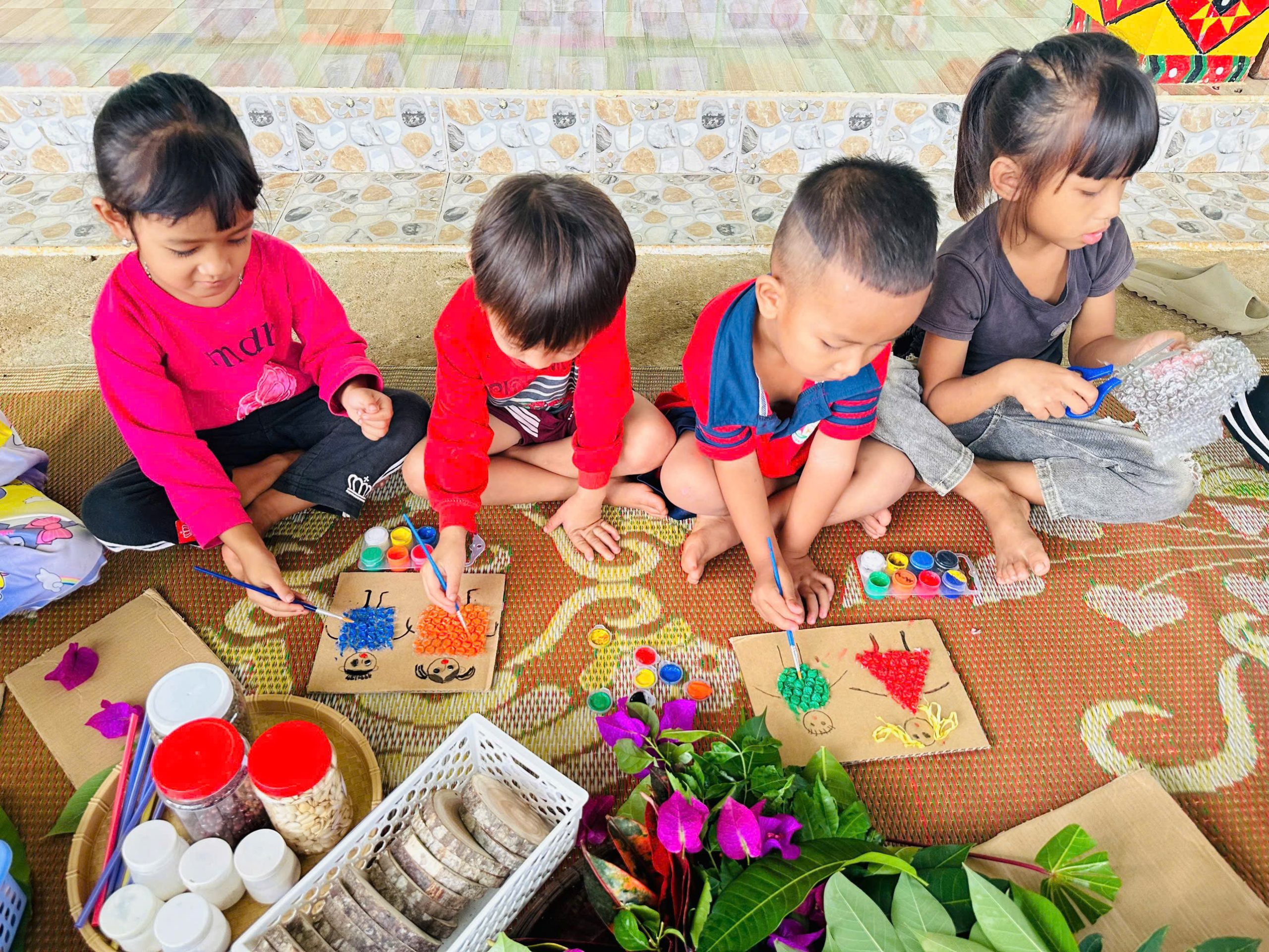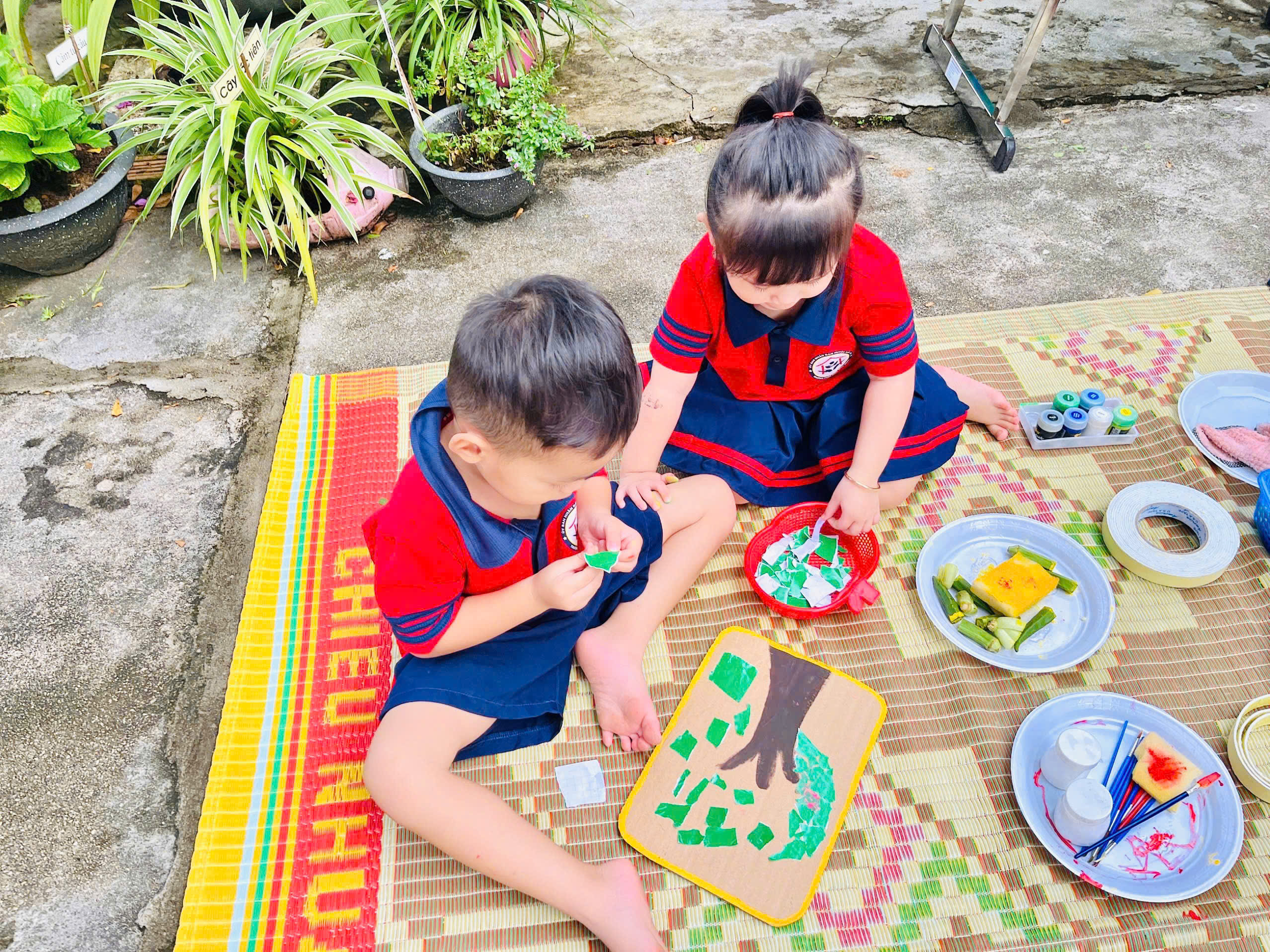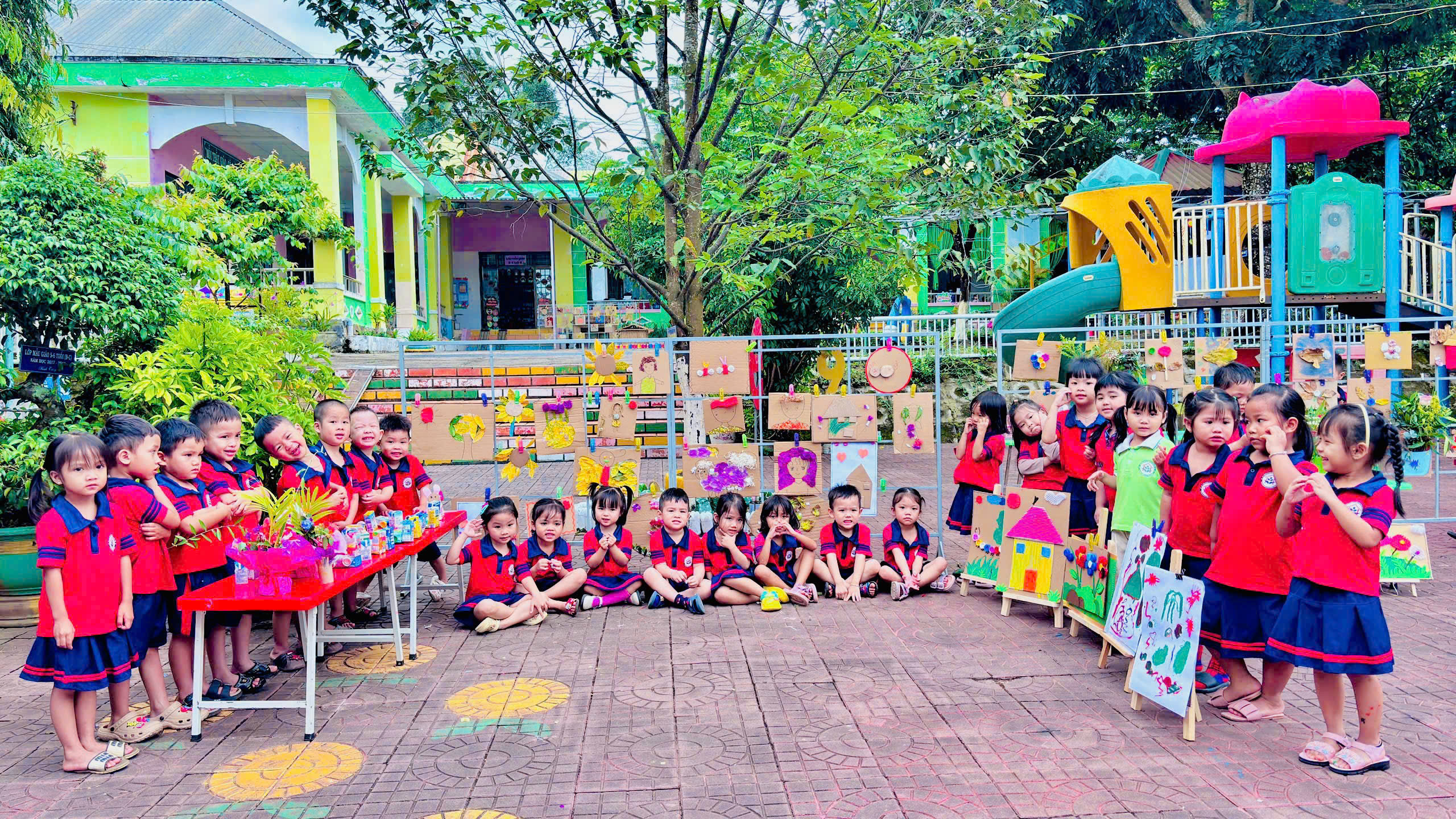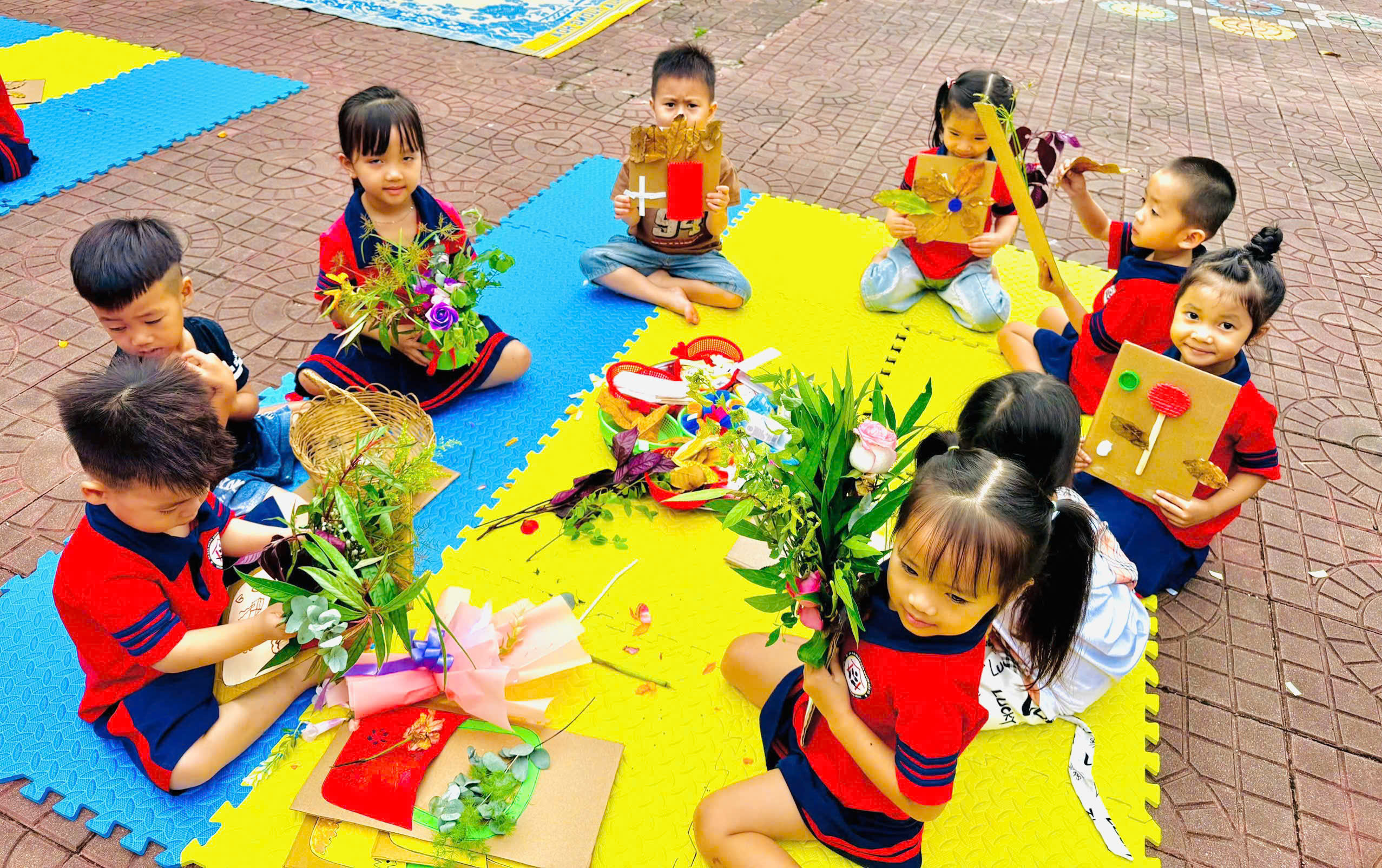 Các bé đã được thỏa sức sáng tạo, khéo léo tạo nên nhiều sản phẩm đáng yêu từ những nguyên vật liệu gần gũi, thân thiện với môi trường như giấy, lá cây, hoa khô, chai nhựa, lõi giấy, hột hạt, bìa cát tông, khay trứng,…